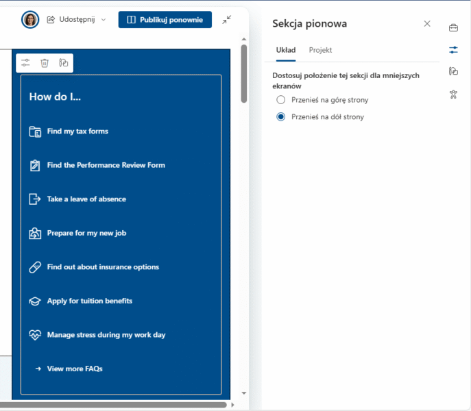 - Zwróc uwagę na to jak układają się poszczególne sekcje na stronach w Twoim intranecie po zmniejszeniu rozdzielczości ekranu.