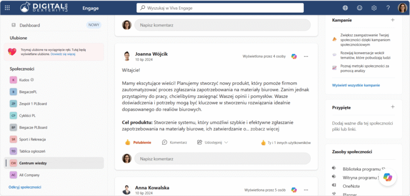 - Pozwól pracownikom na luźną wymianę pomysłów, wiedzy, czy dzieleniem się swoim hobby w społecznościach na Viva Engage.