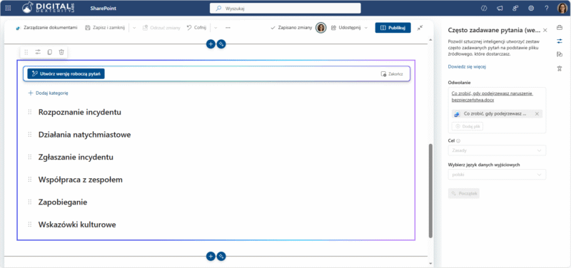 - Jako redaktor/ka korzystaj z opcji dostępnych w ramach licencji Microsoft 365 Copilot przygotowując podsumowania treści dla użytkowników i tworząc sekcje FAQ przy pomocy Copilot tak, aby jak najbardziej ułatwić użytkownikom przetwarzanie informacji.