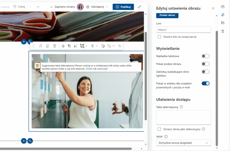 Na start warto wiedzieć, że SharePoint Onilne spełnia wymogi WCAG 2.1 AA i umożliwia tworzenie dostępnego intranetu. Są jednak dodatkowe kroki, o które musimy zadbać sami.