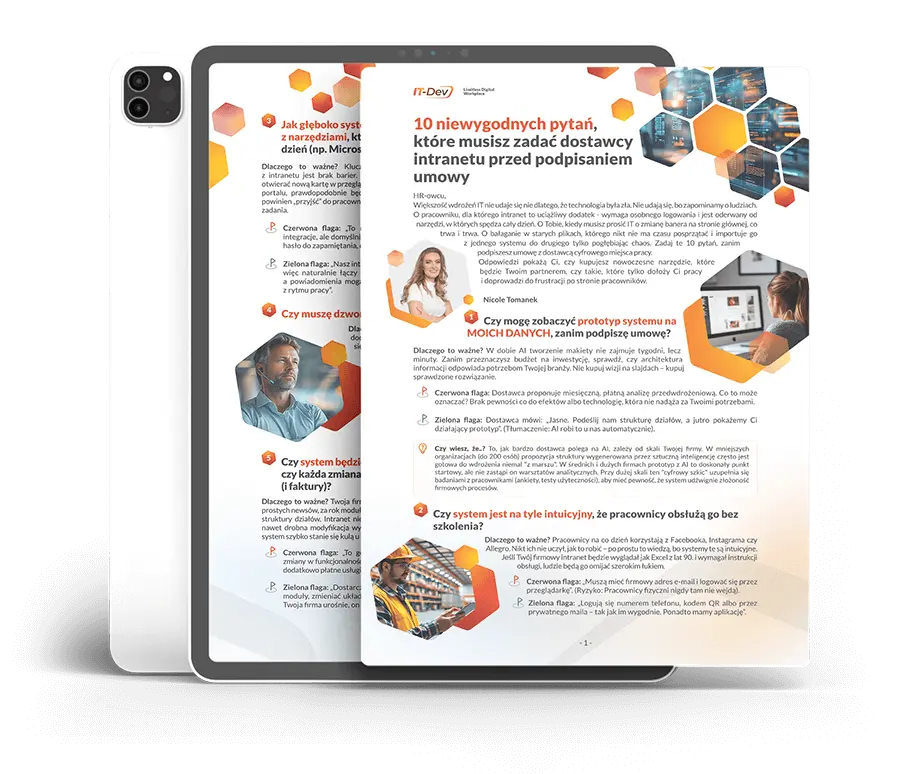 Zapisz się na listę oczekujących i odbierz prezent! Otrzymasz listę 10 niewygodnych pytań, które musisz zadać dostawcy intranetu przed podpisaniem umowy, a w dniu premiery e-book trafi prosto na Twoją skrzynkę.